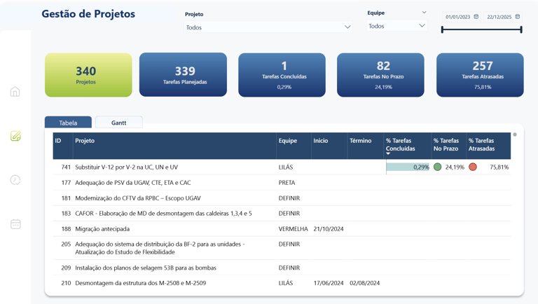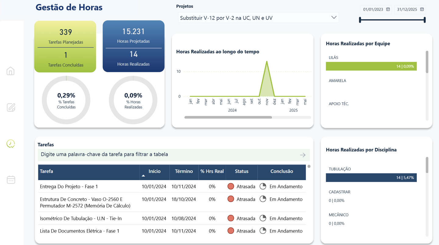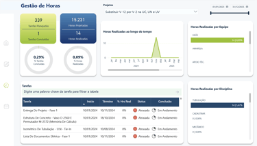 A empresa enfrentava dificuldades em acompanhar o andamento das frentes de trabalho. Não havia uma padronização no reporte do progresso das atividades, as horas eram registradas manualmente e os gestores tomavam decisões com base em informações atrasadas e imprecisas.