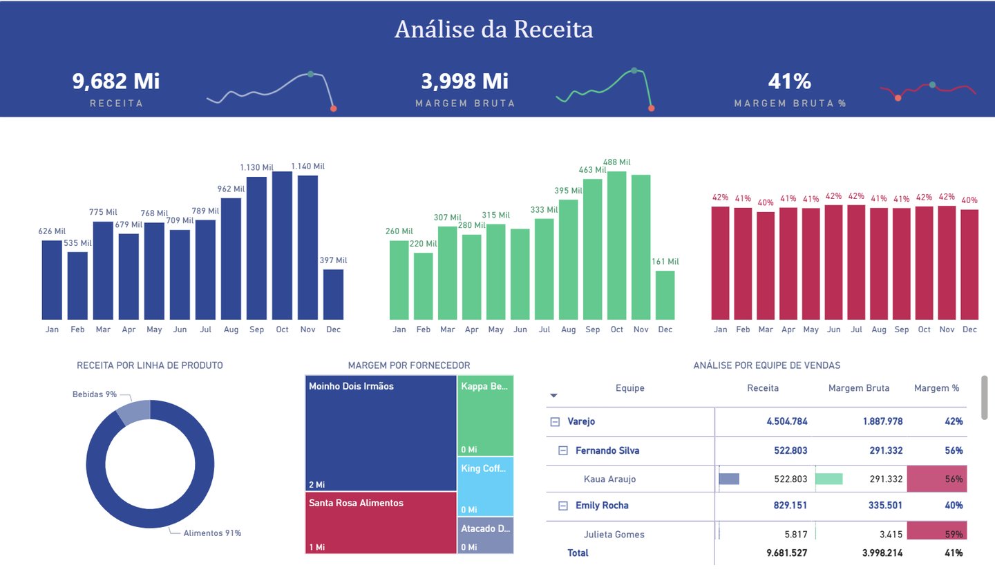 Monitorar Receita total, Margem Bruta e % Margem, com análise de tendências mensais.